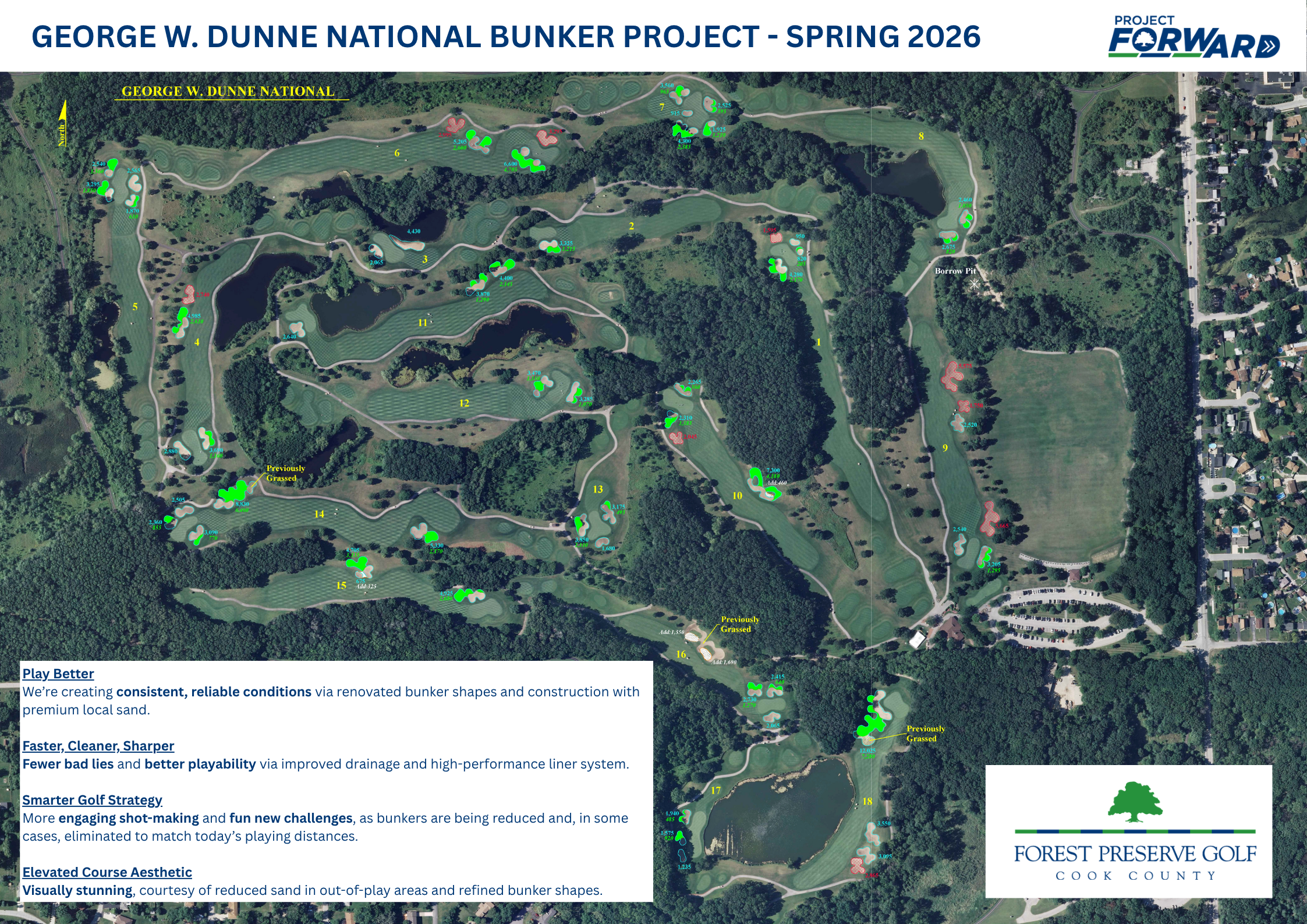 Since opening in 1982, one of the legendary hallmarks of George Dunne Golf Course is its 150,000 square feet of bunkers. We have undertaken a total renovation of the course’s entire bunker complex – from reshaping and reducing bunkers, to installing new drainage and lining foundations that will last for many, many years – this goes well beyond adding sand!